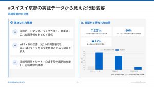京都市での「スイスイ京都」実証実験では、混雑度の見える化により、ユーザーの行動変容を促す成果が確認されました。