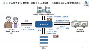 ビジネスモデルとしては、まずは1自治体での導入からスタートし、順次東京都全域、さらには関東全体への展開を想定。中長期的には、他社の交通サービスとの連携や、周辺事業との接続も視野に入れています。利用者への価値提供だけでなく、地域・交通事業者・自治体・民間企業が連携する持続可能な交通サービスモデルとして期待されています。