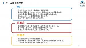 チーム開発を進める中で直面した課題や、改善点についても振り返りがありました。