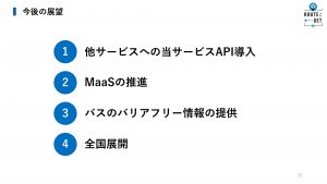 スマートフォンから全国のバス停情報や車両のバリアフリー設備の有無、運行状況などを簡単に確認できるほか、鉄道やタクシー、シェアサイクルなどのMaaSとの連携にも対応。