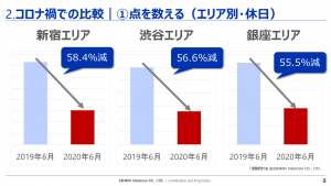 2020年の滞在数は2019年に比べて5割強の落ち込みがあり、繁華街での人の滞在数は大幅に減少したことがわかります。