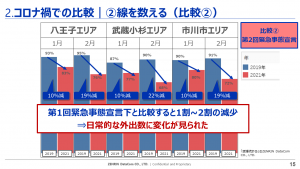 次の図は第2回緊急事態宣言中の2021年1月・2月と2019年1月・2月の八王子、武蔵小杉、市川市エリアの外出率を比較したものです。第2回緊急事態宣言中では前年に比べて近距離の移動も減少しています。