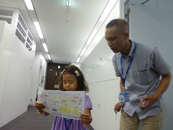 今年のファミリーデー企画は、社員のお子様が入社体験をして、フロアを歩き回り社員と名刺交換をしながらゴールを目指すものです。