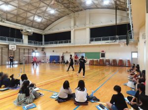 矢ケ部選手含めたデフバドミントンの選手3名は、小学校4年生2クラスを対象に自己紹介後、新町小学校の時と同様にデフリンピックについての講演とデモンストレーションを行いました。