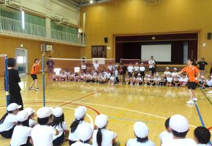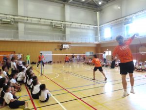 競技体験の最後には、希望した児童を対象に日本代表選手のスマッシュ体験も行われました。迫力のあるスマッシュに、児童たちは歓声を上げながら楽しんでいました。