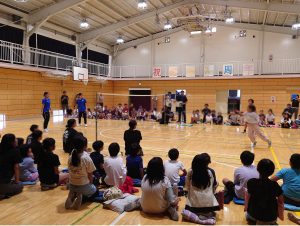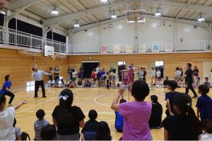 児童とのミニゲームが終わると、先生達と選手のミニゲームが行われ、特に校長先生との対戦の際には会場のボルテージは最高潮に。仲間を応援する子どもたちの声援が体育館いっぱいに響き渡りました。