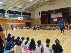講演後は、選手によるデモンストレーションが行われました。ドライブやスマッシュ、3点先取のゲームを披露し、児童たちは迫力あるプレーに歓声をあげていました。