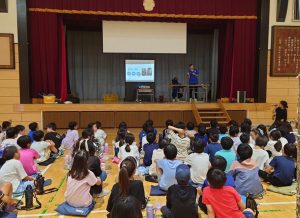 11月に東京で行われるデフリンピックに向けた普及啓発活動の一環として、デフバドミントン日本代表選手の矢ケ部選手・鎌田選手は、小学校4年生4クラス108名を対象にデフスポーツやデフリンピックについての講演を行いました。
