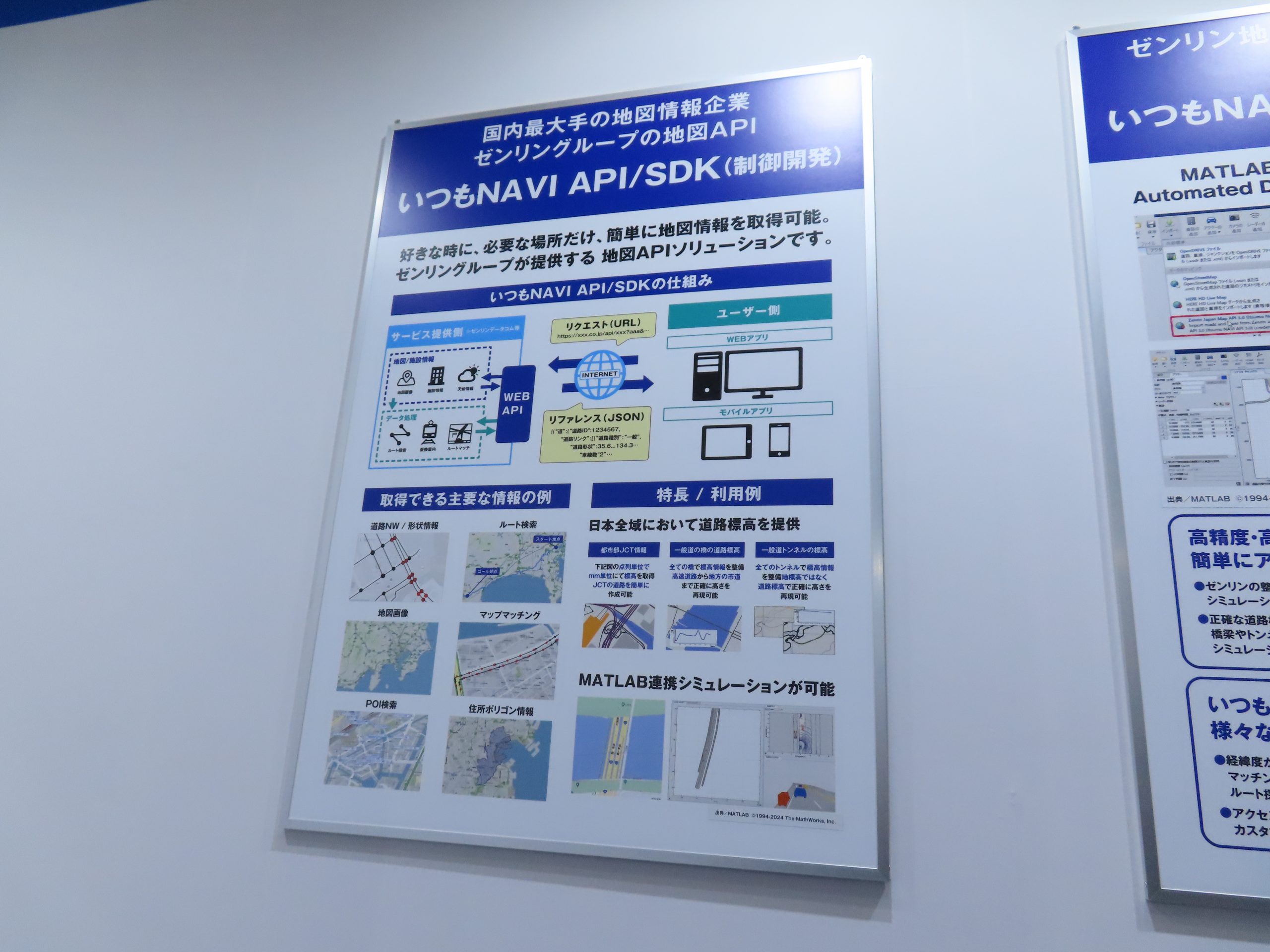 ブースでは、「いつもNAVI API/SDK」や自動車専用道路の3D高精度地図である「HD-Map」、都市を忠実に再現した「ゼンリン3Dソリューション 3D地図データ」、「Honda フローティングカーデータ」「混雑統計®」「Z-NAV」について、パネルや動画で紹介しました。