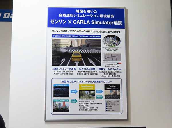 MathWorks社提供の自動運転シミュレーション・テストツール「MATLAB/Simulink」「RoadRunner」、そしてオープンソースの自動運転シミュレーションツールである「CARLA Simulator」とゼンリン地図データとの連携ついても紹介しました。