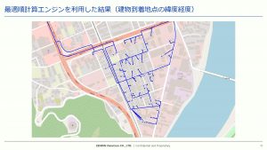 住所から取得したルート情報だけでは順番最適化ができないが、ゼンリンで持っている建物到着地点の情報と組み合わせることで人が訪問しやすいルート計画を自動的に作成してくれる。