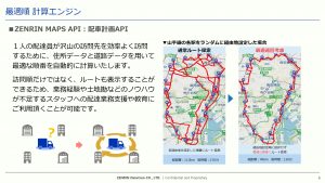 当社が持っているルート検索のエンジン機能「ZENRIN Maps API」では、複数地点を最適にまわれるよう自動的に計算してくれる。