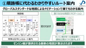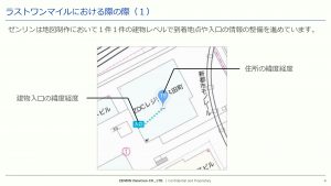 ゼンリンの地図制作は、地図を作る過程で建物に付随する情報(建物の入り口の情報や到着する地点の整備等)をたくさん整備している。