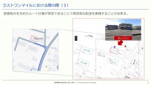 正しい配送ルートを表示できることで、高効率な配送計画を実現することができる。