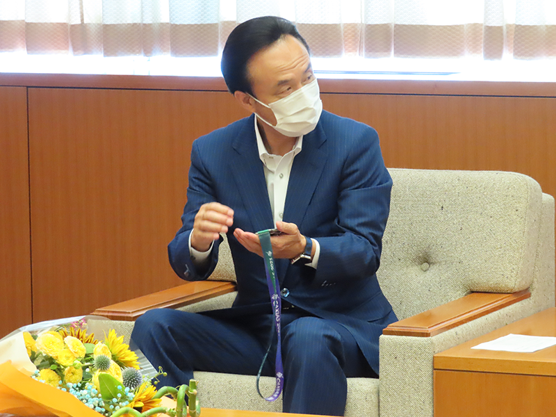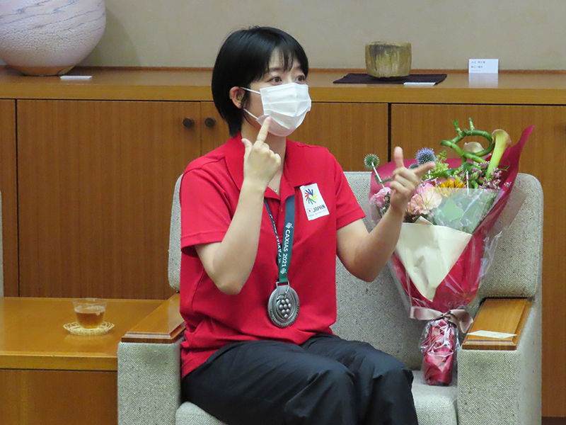 花束贈呈、写真撮影後には懇談が行われ、デフリンピックの開催地や大会の動向について、またこれまでのバドミントン経験や練習についてなど、富岡市長、二見 隆久教育長と長原選手含む3名の参加選手は言葉を交わしました。