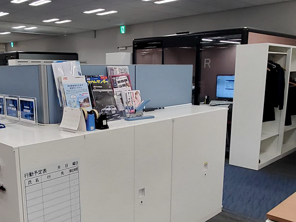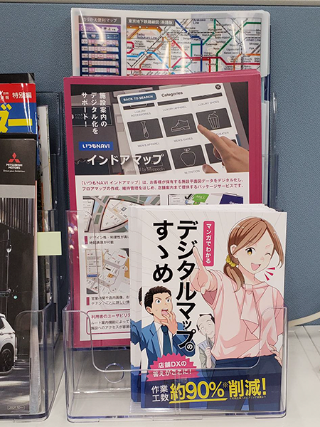展示会にて配布された漫画冊子はインドアマップのカタログと共に、田町オフィス内 会議室Booth-R付近のキャビネットの上に設置されています。