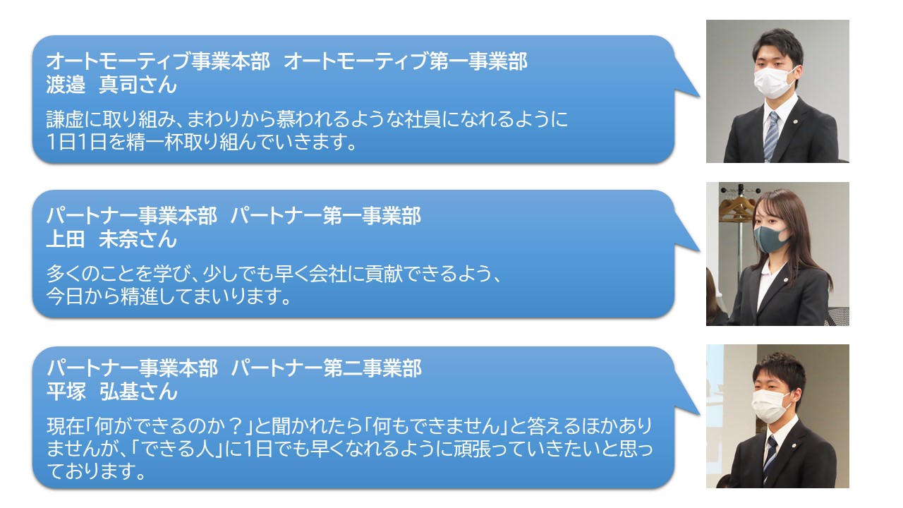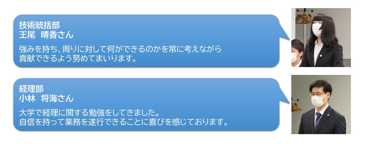 コロナの影響により内定式から不自由な生活が続いたと思いますが、こうして元気な姿で今日を迎えられたことをうれしく思います。