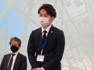 開発統括本部 ソリューション開発本部 ソリューション第一開発部、田中悠貴さんが新卒新入社員へ歓迎の言葉を送りました。