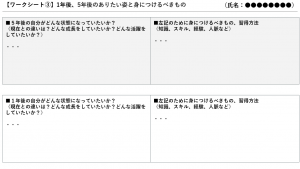 3つ目のワークでは、1年後・5年後のありたい姿と身につけるべきものについて一人ひとりワークシートにまとめ、グループ内で発表しました。
