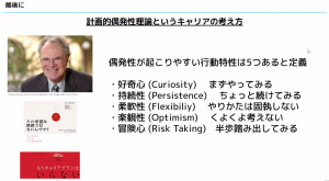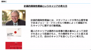 3つのワークショップ後、講師より「偶然の出来事がキャリアに影響する」という計画的偶発性理論について説明いただきました。