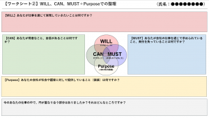 2つ目のワークは、Will、Can、Must+Purposeの整理を行い、先ほどと同じグループ内で発表しました。