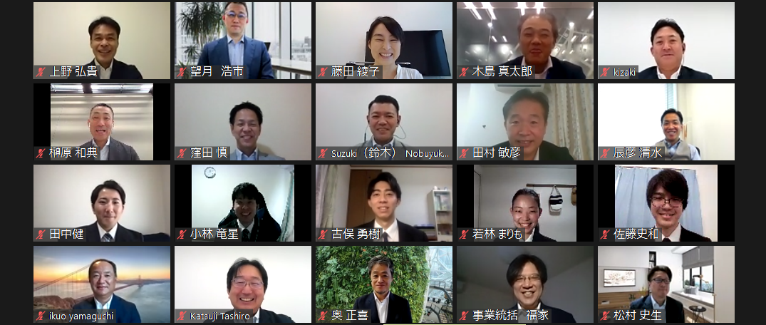 今回の内定式は新型コロナウイルス感染拡大防止、また接近する台風16号による影響でオンラインでの実施となり、取締役5名、役員8名そして内定者5名は画面越しでの参加となりました。