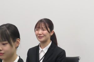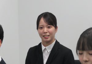 「お茶の水女子大学文教育学部言語文化学科グローバル文化学環から参りました小澤 笙子と申します。私の強みは積極的に学んでいく主体性と向上心なので、この強みを生かして先輩方から積極的に学んで、この会社にこの人がいてくれてよかったと思っていただけるような、お客様からも会社の方からも思っていただけるような社会人になれるように一生懸命努力して参りますのでよろしくお願いいたします。」