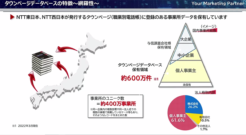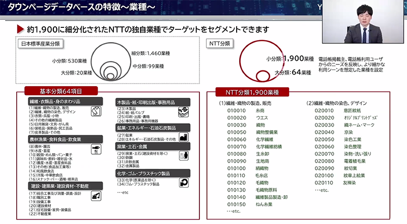 三友さんは「タウンページデータベース」の主な特徴として、①データの網羅性②独自の業種分類の2つを挙げました。