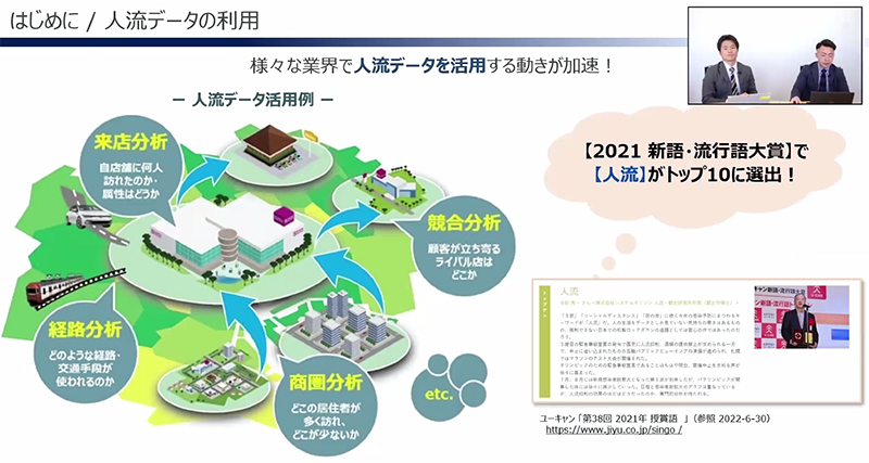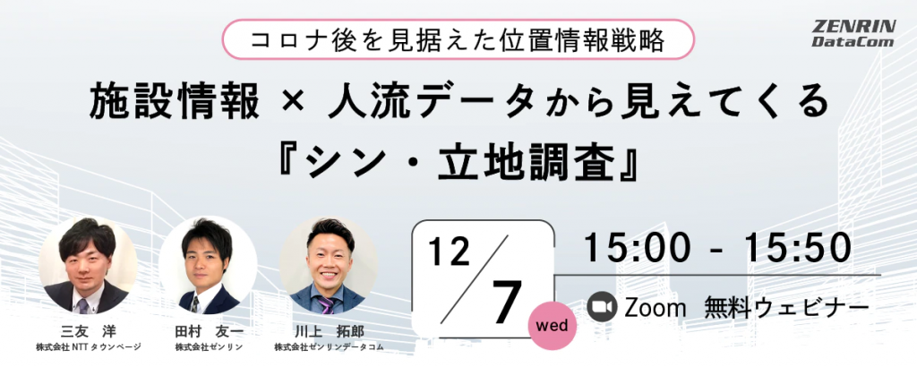 2022年12月7日(水)15時00分~15時50分、3社共催のウェビナー「コロナ後を見据えた位置情報戦略 施設情報×人流データから見えてくる『シン・立地調査』」が開催され、「混雑統計®」を活用した新しい立地調査の手法を紹介しました。