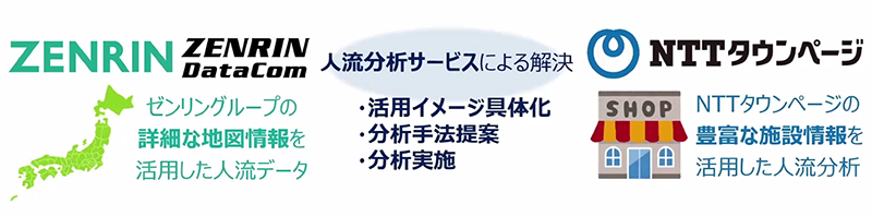 このような課題を解決するために、ゼンリングループの詳細な地図情報を活用した人流データとNTTタウンページ社の保有する豊富な施設情報を掛け合わせた新しい人流分析サービスの導入を提案しました。