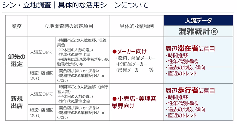 このような高鮮度な施設情報である「タウンページデータベース」と人流データ「混雑統計®」とを掛け合わせることで、「誰が・いつ・どこへ移動したか」「人が多く滞在する場所にはどのような施設があるのか」を把握することでき、精緻なエリアマーケティングの実現が可能なことから、三友さんは新しい人流分析サービス(立地調査)の優位性を示しました。