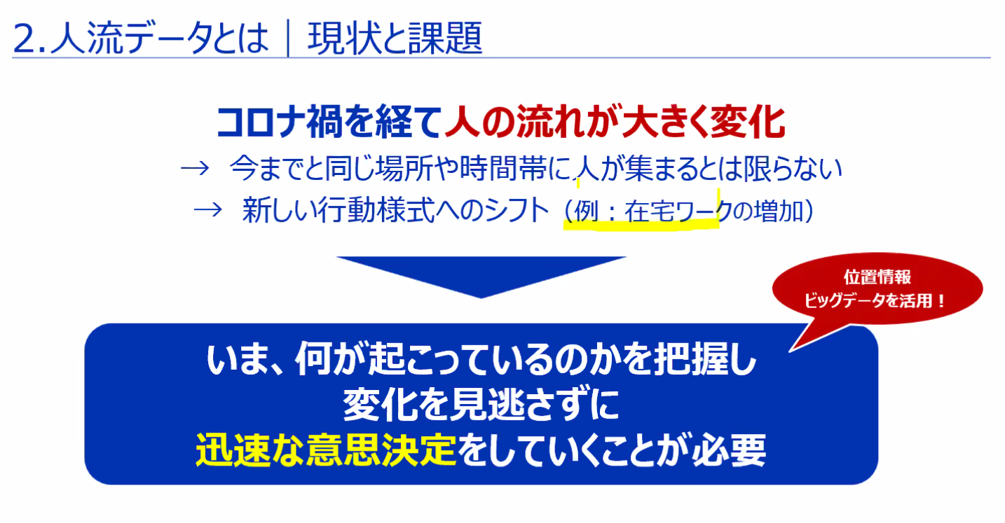 川上さんははじめに人流データのニーズの高まりや人流データの活用の目的について説明しました。