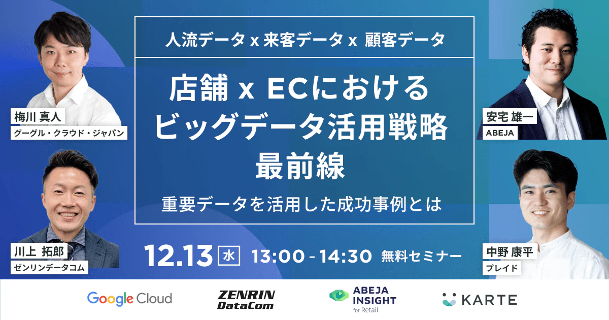 2023年12月13日(水)13時00分~14時30分、当社そして株式会社ABEJA(以下 ABEJA社)、株式会社プレイド(以下 プレイド社)、グーグル・クラウド・ジャパン合同会社(以下 グーグル・クラウド・ジャパン社)の4社による共催ウェビナー「人流データx来客データx顧客データ 店舗・ECにおけるビッグデータ活用戦略最前線」が開催され、IoT第二事業部の川上 拓郎さん(以下 川上さん)が登壇しました。