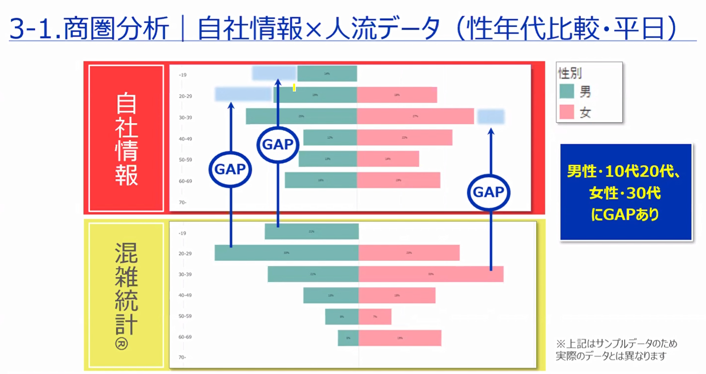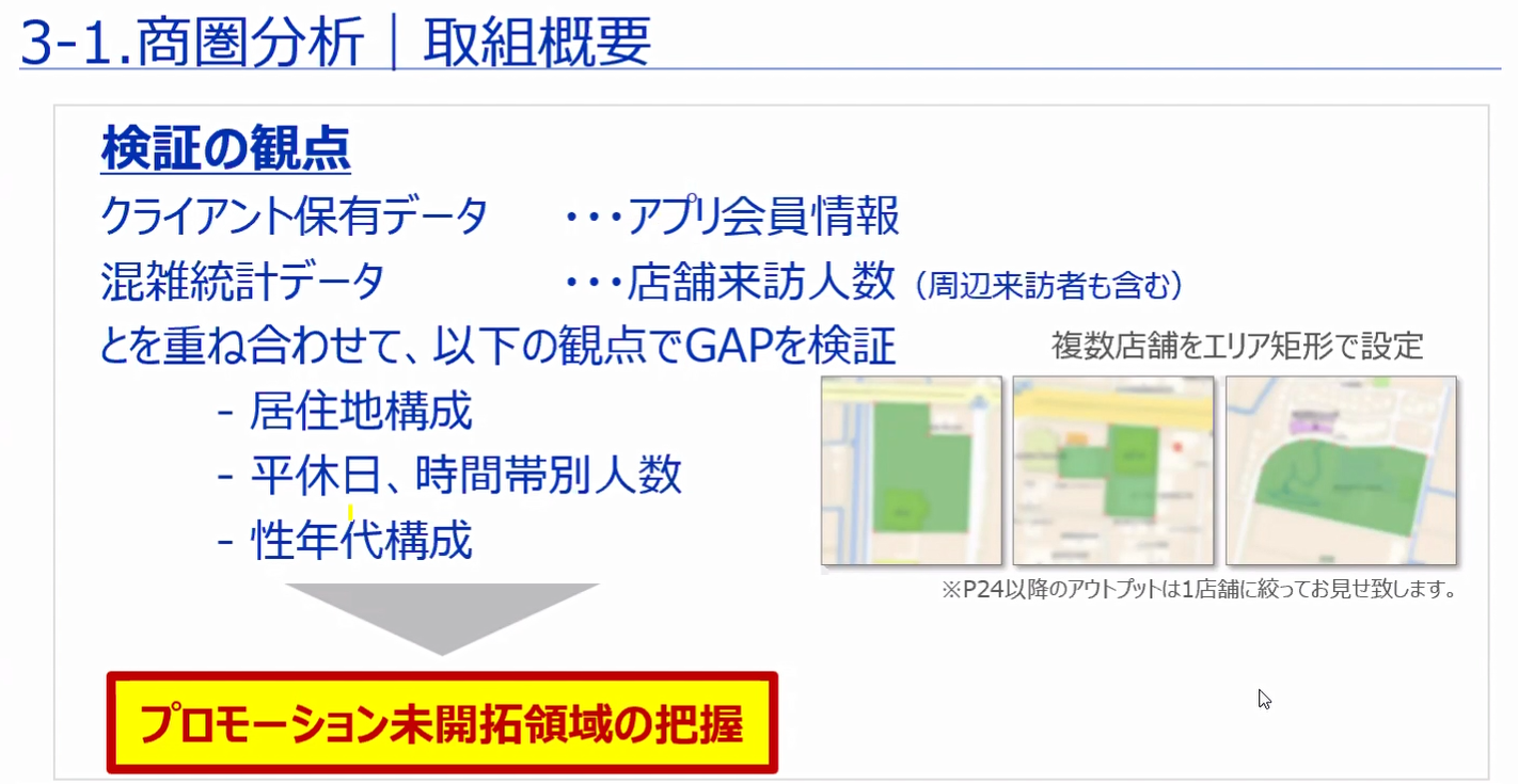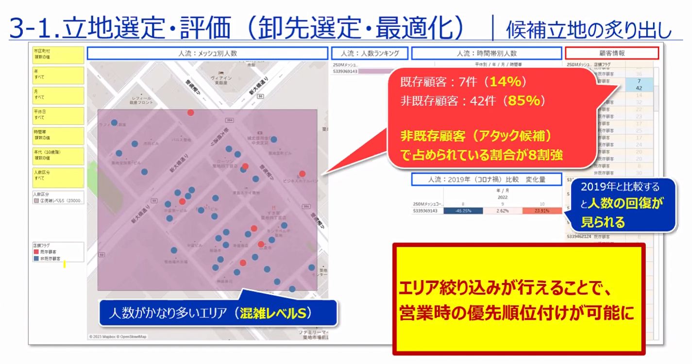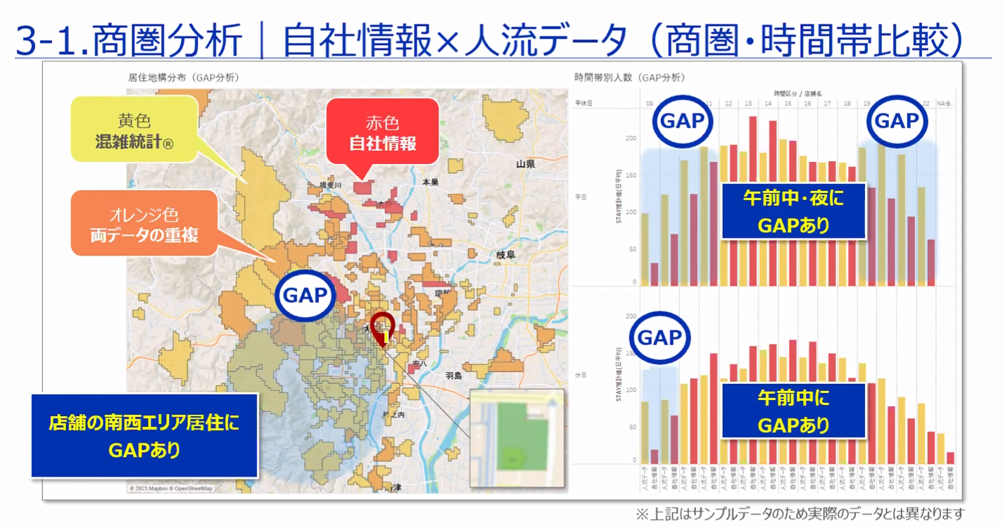 「混雑統計®」の活用によって、商圏分析としては、クライアントの保有するデータとのGAP分析やターゲットの特定が可能となる点、また立地選定・評価としては立地の絞り込みや営業の効率化が図れるようになる点をアピールしました。