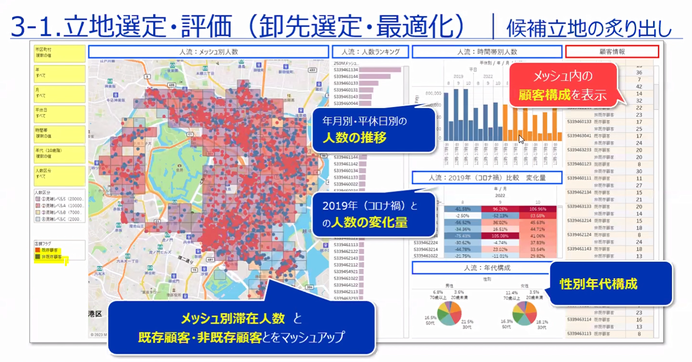 事例としては、商圏分析(店舗運営最適化)・と立地選定・評価(立地戦略立案)の手法を紹介しました。