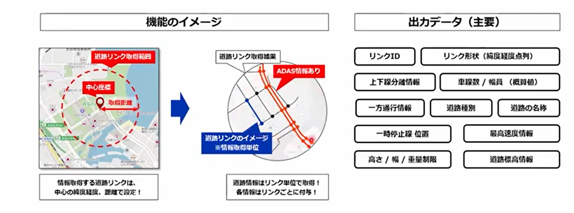 緯度経度を指定して検索をかけると該当の道路リンク情報を返却することができる機能です。