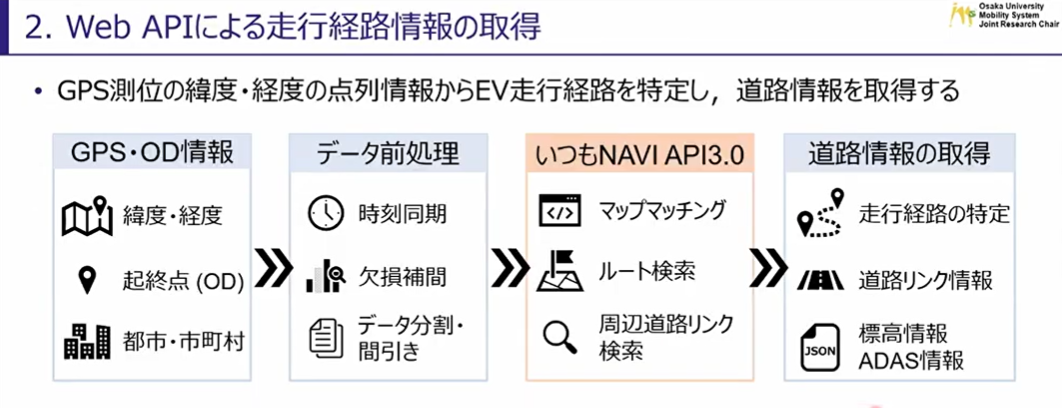 この研究・開発の中で、EVの走行経路の特定(マップマッチング機能を使用)や緯度・経度・標高といった各種道路情報を取得する際に「いつもNAVI API3.0」は利用されています。