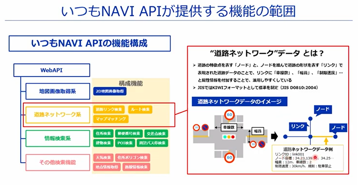 最後に三橋さんより、地図画像や施設情報・制限速度など、さまざまな特性情報を持った道路ネットワークデータを提供する「いつもNAVI API3.0」の特徴と利用までの流れについて説明が行われました。