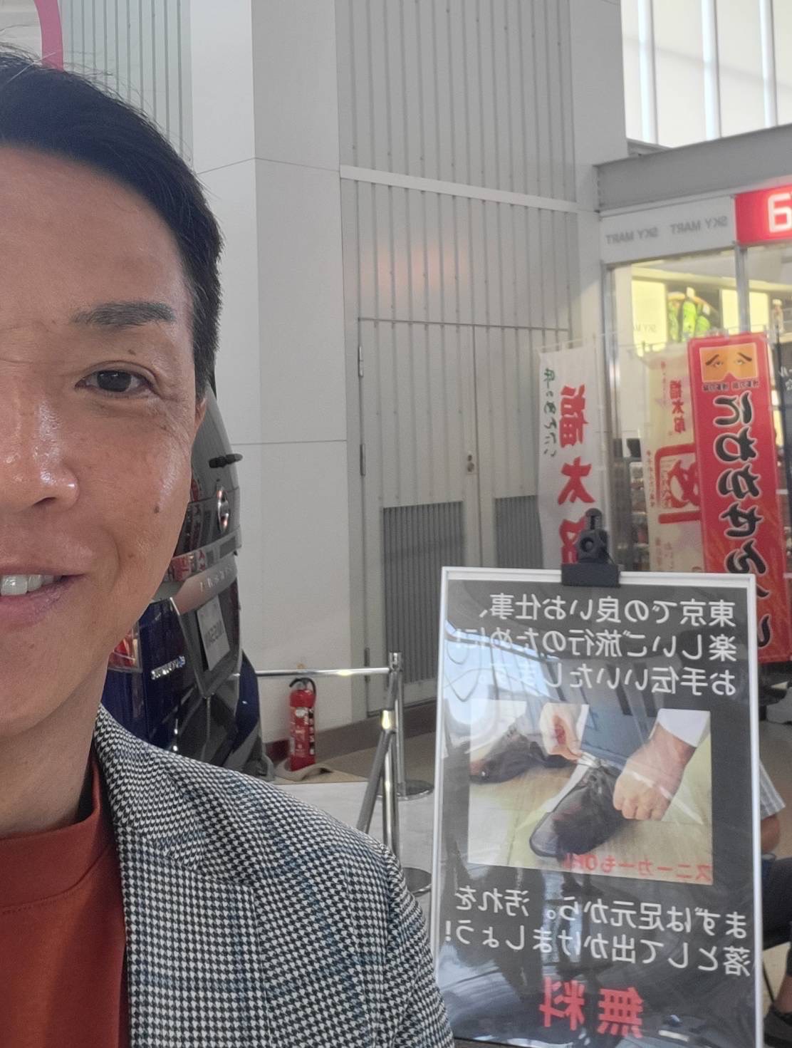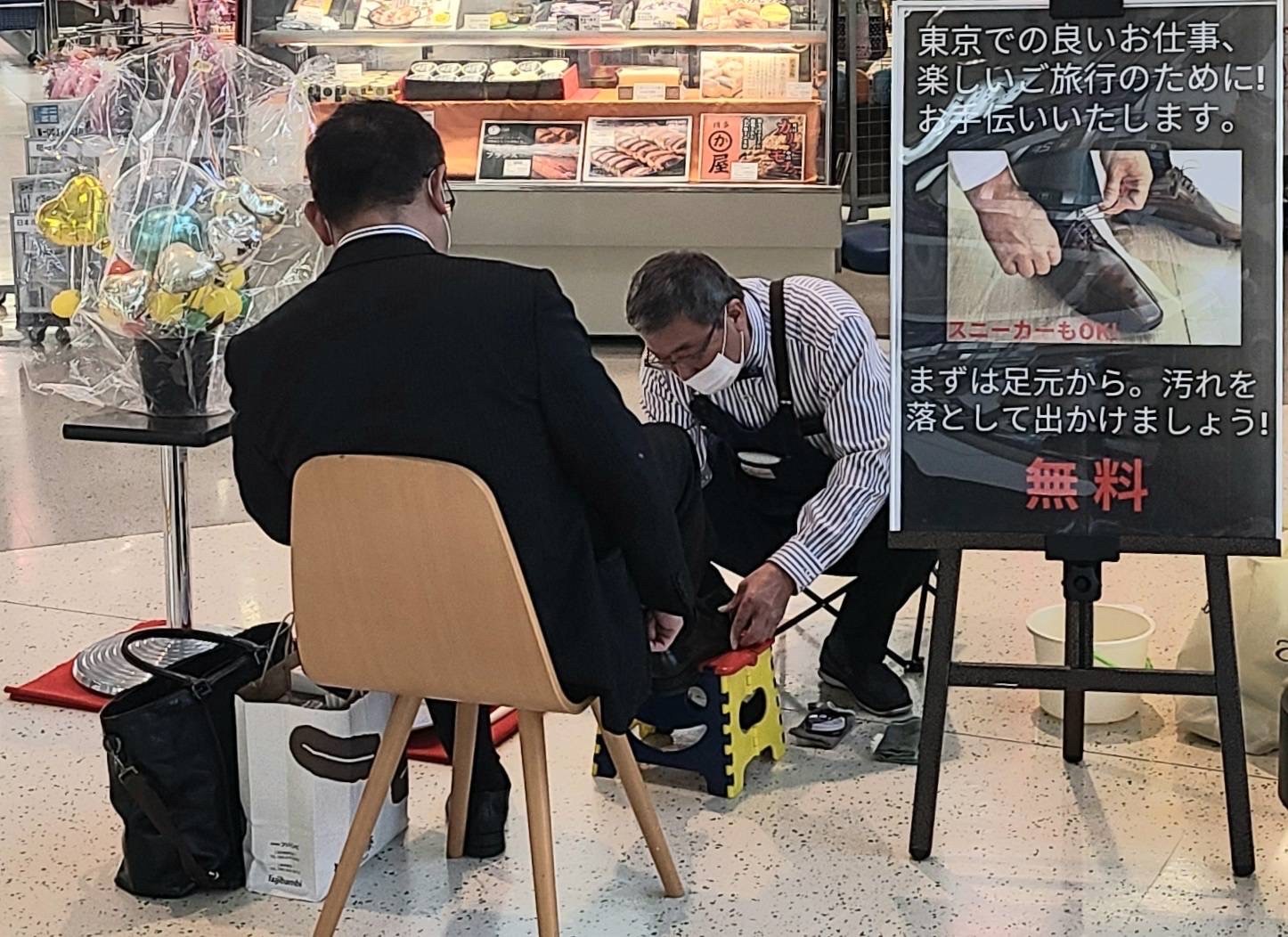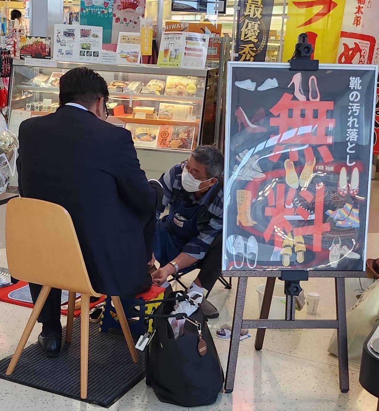 スターフライヤー前社長の松石禎己さんが北九州空港2階ロビーで靴磨きの無料サービスを行っています。退職されて2年、午前中に時間がある時だけ、お世話になった空港とお客様への恩返しをしたいという思いでずっと続けられています。ソールを車用ワックスで磨きあげてくれるのでピカピカになります。