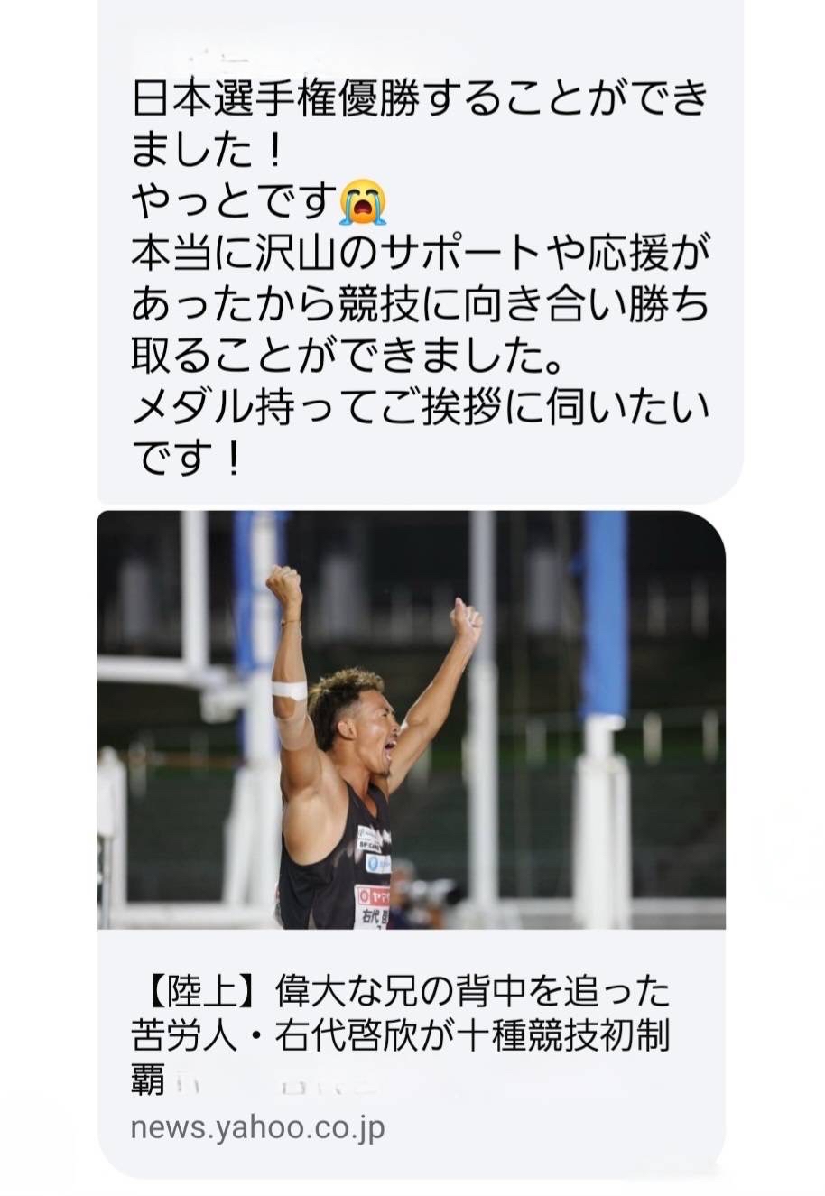 応援している右代さんが10種競技の日本選手権で優勝したとの報告を受けた。