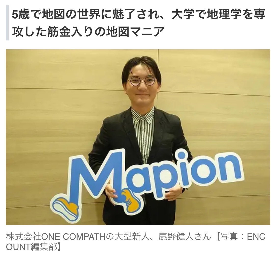 株式会社ONE COMPATH(ワン・コンパス)の鹿野健人さんは、幼い頃から地図をこよなく愛する筋金入りの地図マニア。地図アプリの開発企業で、入社後わずか半年で新たな地図を開発した大型新人。OJT研修中にすべての地名がひらがなで表記されたひらがなの地図を企画として提案した。これがユニークだと上層部の目に留まり、いきなり地図開発を任されることになったという。
