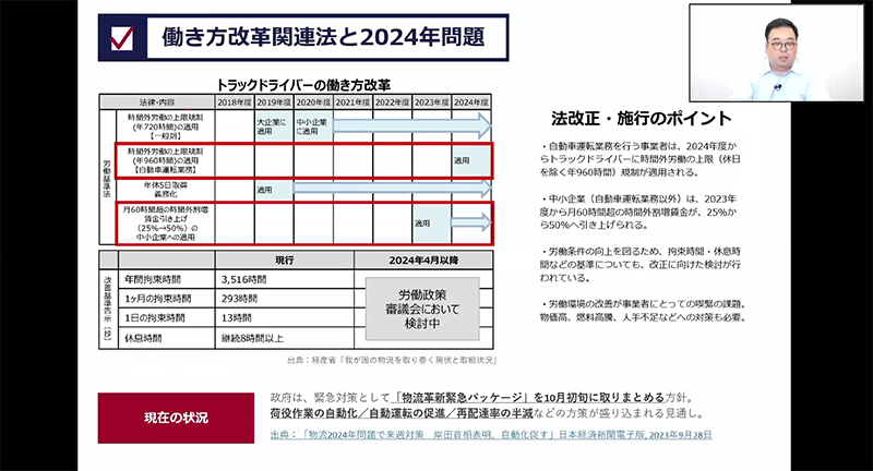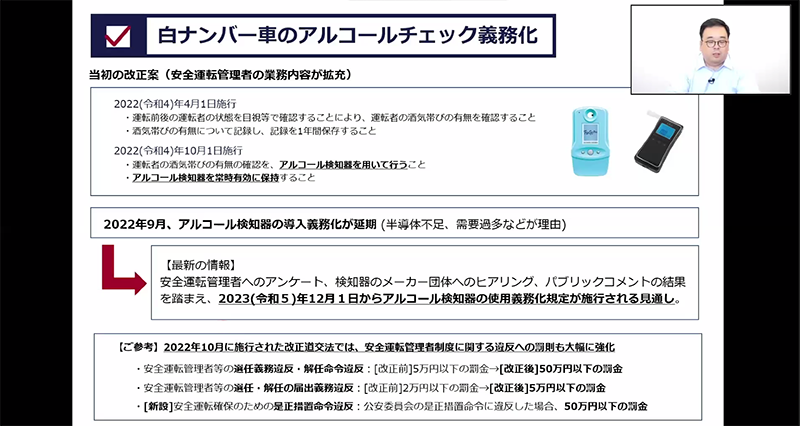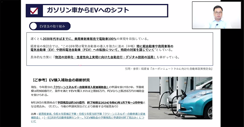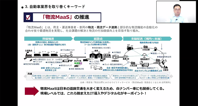 井上さんは、白ナンバー車のアルコールチェック義務化、2024年問題、EVシフトといった自動車業界内で関心の高いテーマや、物流MaaSの推進、IT機器導入、デジタル化など、自動車業界を取り巻くキーワードについて解説しました。