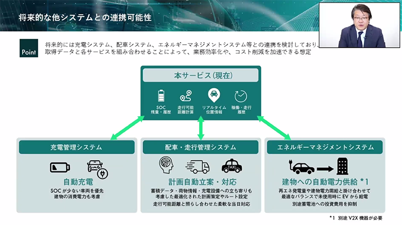 清さんは講演の最後に、「将来的には『e-mobilog』で取得したデータと充電管理システムや配車システム等を連携させることで、業務効率化やコスト削減などを目指している」と説明しました。