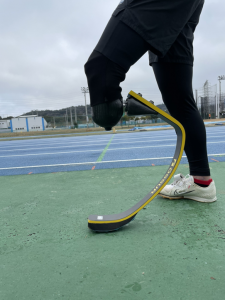 日常用の義足は人間の足に近い形をしており歩くのが主な目的なのですが、競技用の義足はこのような形で走る・跳ぶ動きに特化した形となっております。(直線的な動きは問題なく行えるが急なストップや方向転換は難しくなります。)
